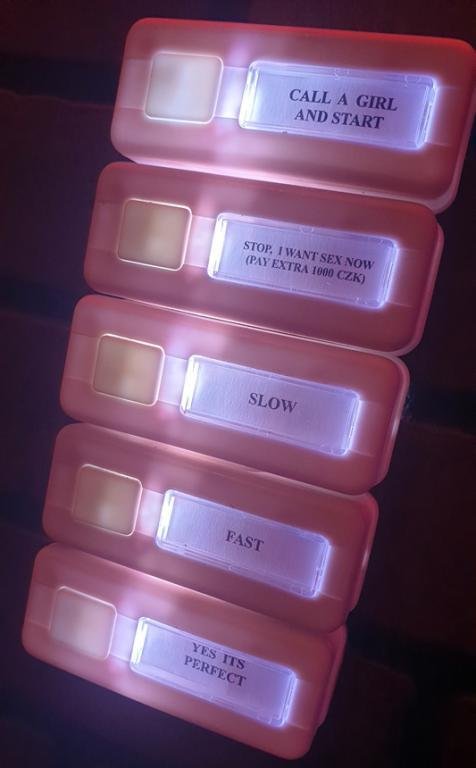 Jako dokonalá vychytávka jsou k dispozici u otvoru tlačítka, kterými dáváte dívce na druhé straně signály, zdali chcete pomalejší tempo, rychlejší tempo, nebo že dokonce chcete Gloryhole opustit, prodloužit setkání o dalších 30 min. a přejít s touto dívkou ke klasickému sexíku (za příplatek 1000 ķč)